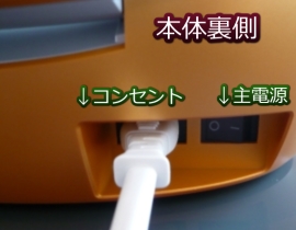 本体の裏側には、電源コードの差し込み口があるので、ここに付属のコードを差し込んで、右側にある主電源のスイッチを入れます。
